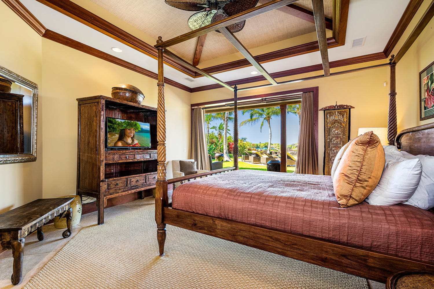 A beautiful courtyard decorated with endemic Hawaiian plants and ponds separates the main oceanfront home from the private Ohana house, which features one king bedroom with a large en-suite bathroom. The Ohana house increases the estates sleep capacity to 12.