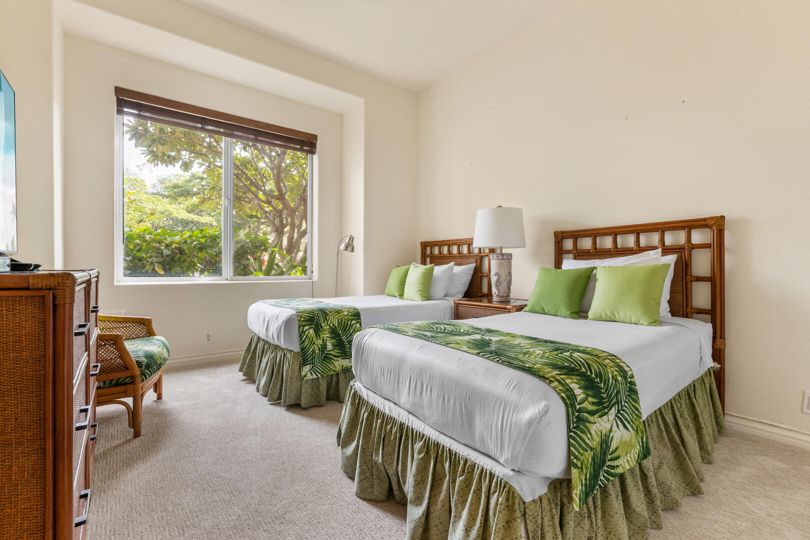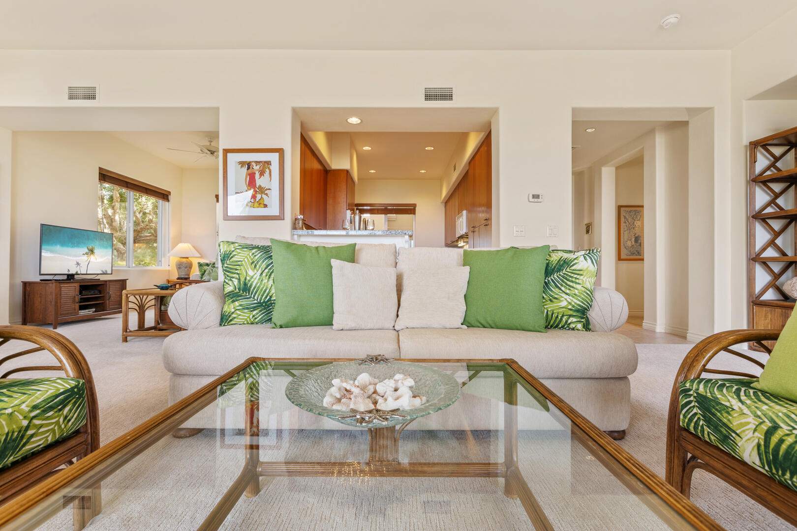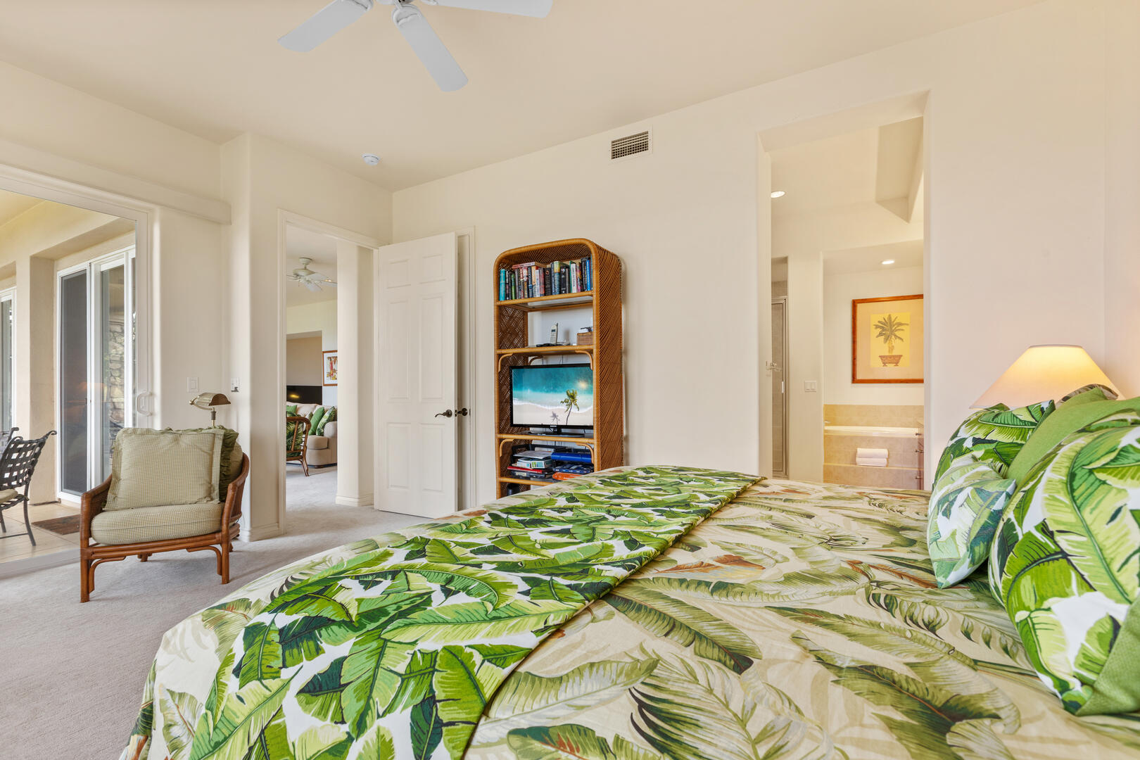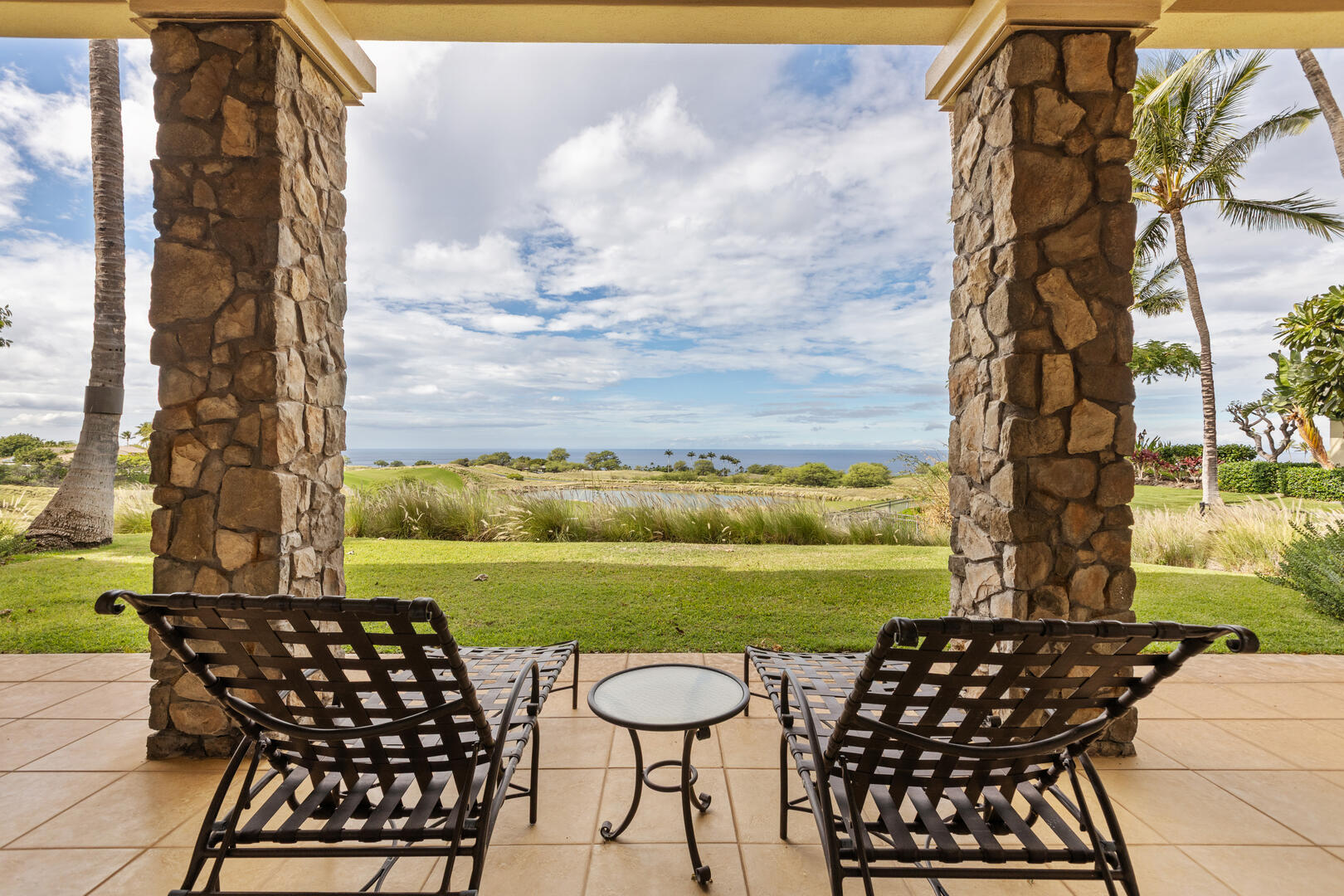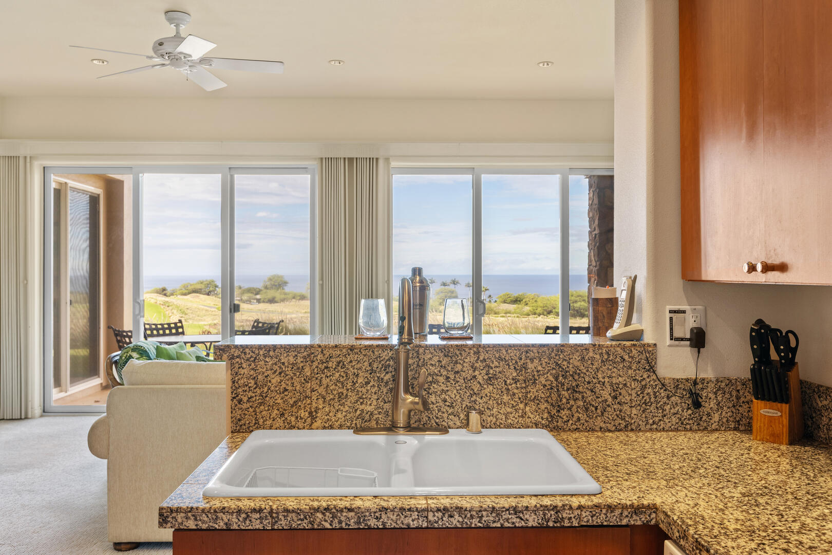 Primely located ground-floor condo with expansive ocean views at the exclusive Mauna Kea Resort, Kumulani A1 has received over 70 five star reviews. This luxurious two bedroom, two bath residence with den was originally selected and furnished as a model because of its sweeping uninterrupted views of ocean, golf course and pond. The spacious living area offers palm-printed, newly reupholstered rattan furnishings, a queen sofa bed that will sleep 2 people, indoor and outdoor dining, and a den area that serves as a media room with a Smart TV. The master bedroom has island inspired decor, a king bed, Roku TV, en-suite, walk-in closet and ocean views while the second bedroom offers two twin beds and TV with basic cable. You will enjoy breathtaking views from the 375 sq. ft. wrap-around lanai, perfect for sunset views. Amenities include fast wireless internet access at no additional charge, central air conditioning, ceiling fans for natural ventilation, and a fully equipped kitchen.