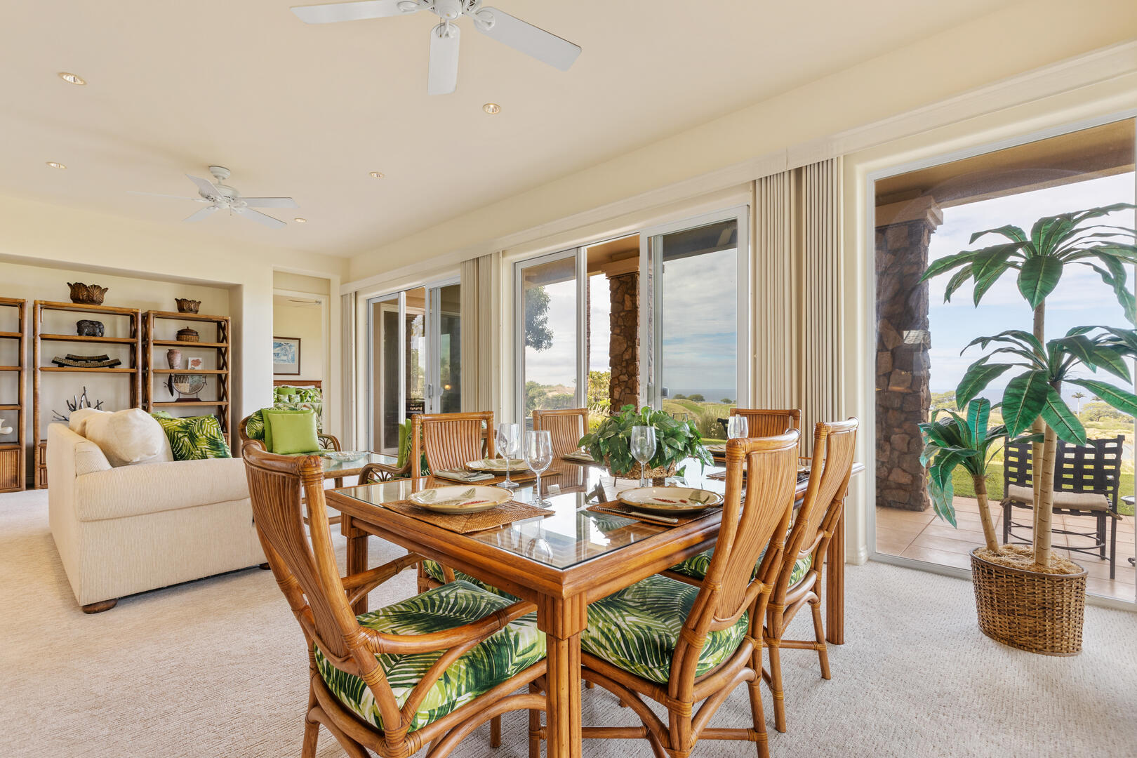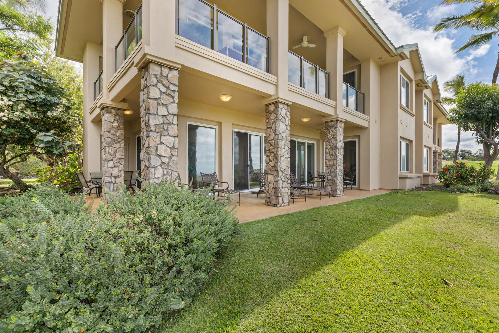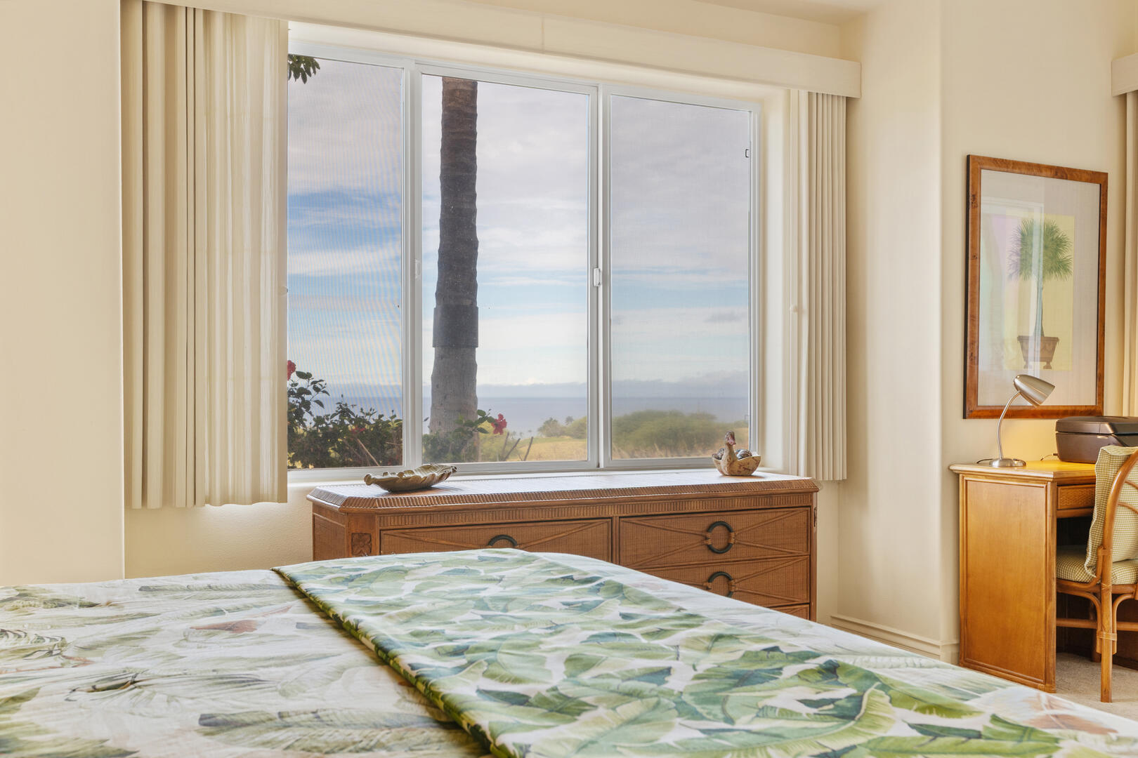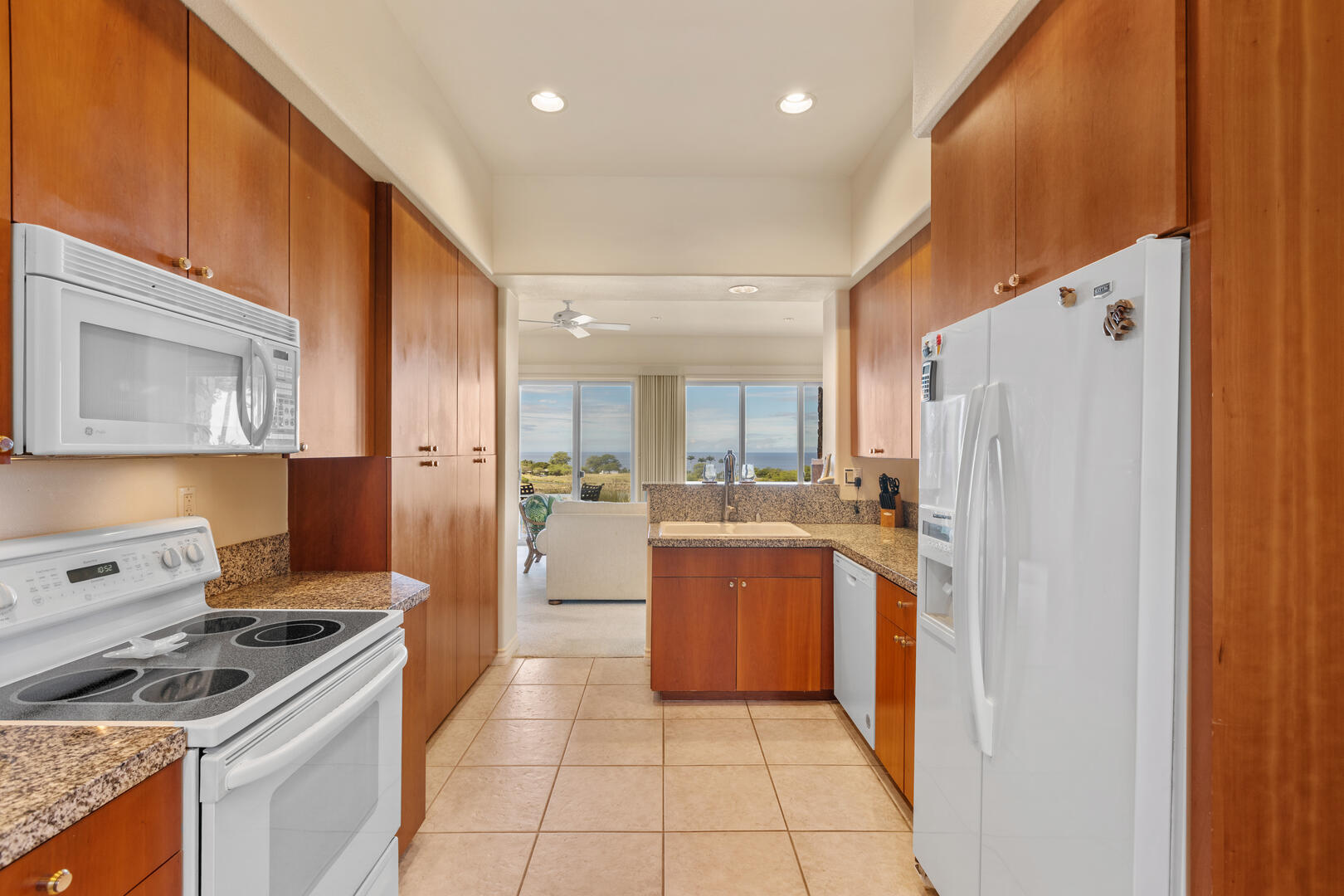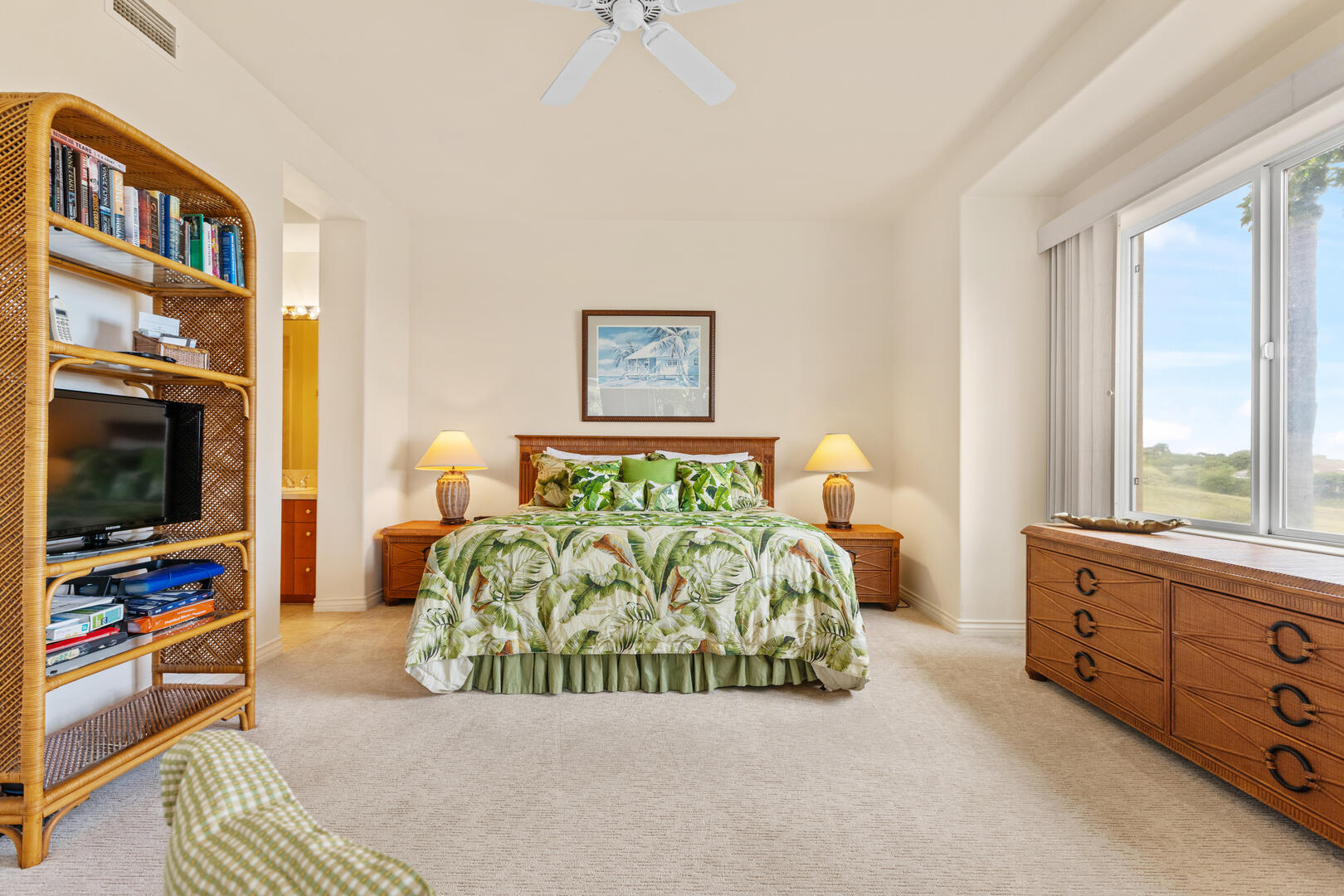 Primely located ground-floor condo with expansive ocean views at the exclusive Mauna Kea Resort, Kumulani A1 has received over 70 five star reviews. This luxurious two bedroom, two bath residence with den was originally selected and furnished as a model because of its sweeping uninterrupted views of ocean, golf course and pond. The spacious living area offers palm-printed, newly reupholstered rattan furnishings, a queen sofa bed that will sleep 2 people, indoor and outdoor dining, and a den area that serves as a media room with a Smart TV. The master bedroom has island inspired decor, a king bed, Roku TV, en-suite, walk-in closet and ocean views while the second bedroom offers two twin beds and TV with basic cable. You will enjoy breathtaking views from the 375 sq. ft. wrap-around lanai, perfect for sunset views. Amenities include fast wireless internet access at no additional charge, central air conditioning, ceiling fans for natural ventilation, and a fully equipped kitchen.