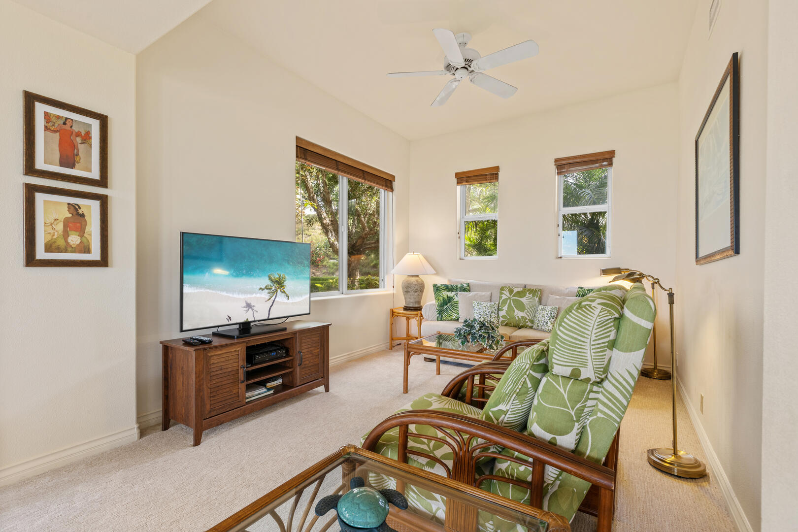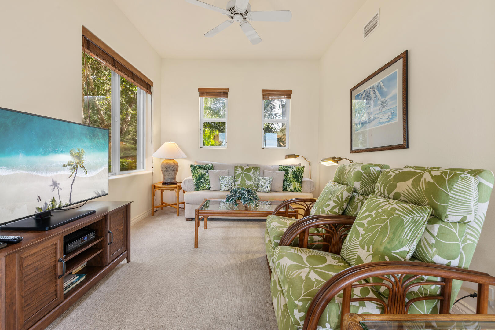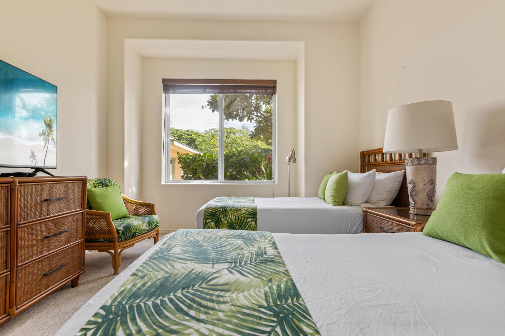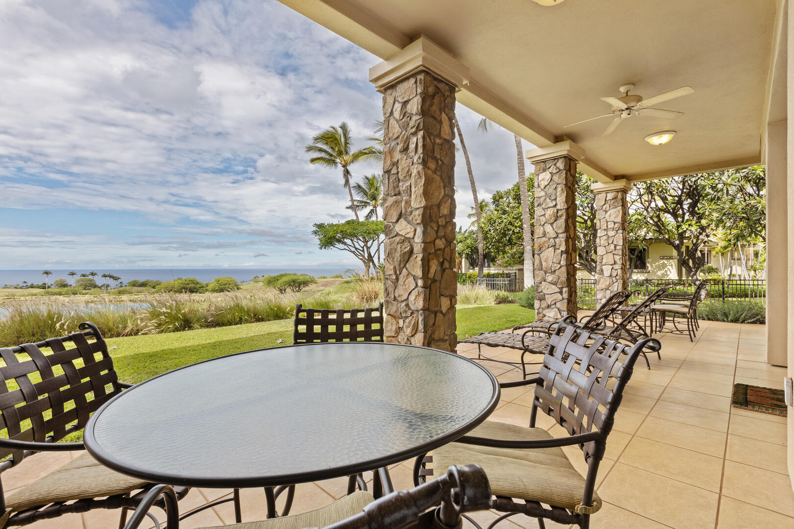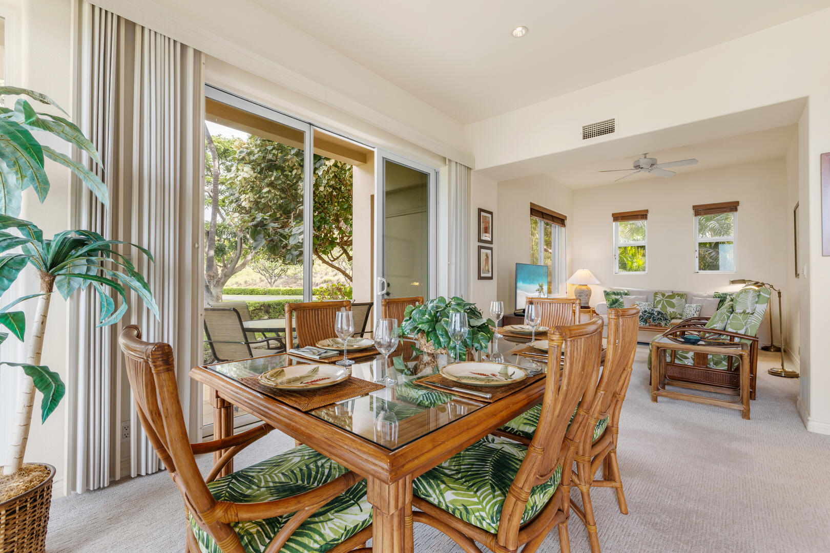 Primely located ground-floor condo with expansive ocean views at the exclusive Mauna Kea Resort, Kumulani A1 has received over 70 five star reviews. This luxurious two bedroom, two bath residence with den was originally selected and furnished as a model because of its sweeping uninterrupted views of ocean, golf course and pond. The spacious living area offers palm-printed, newly reupholstered rattan furnishings, a queen sofa bed that will sleep 2 people, indoor and outdoor dining, and a den area that serves as a media room with a Smart TV. The master bedroom has island inspired decor, a king bed, Roku TV, en-suite, walk-in closet and ocean views while the second bedroom offers two twin beds and TV with basic cable. You will enjoy breathtaking views from the 375 sq. ft. wrap-around lanai, perfect for sunset views. Amenities include fast wireless internet access at no additional charge, central air conditioning, ceiling fans for natural ventilation, and a fully equipped kitchen.