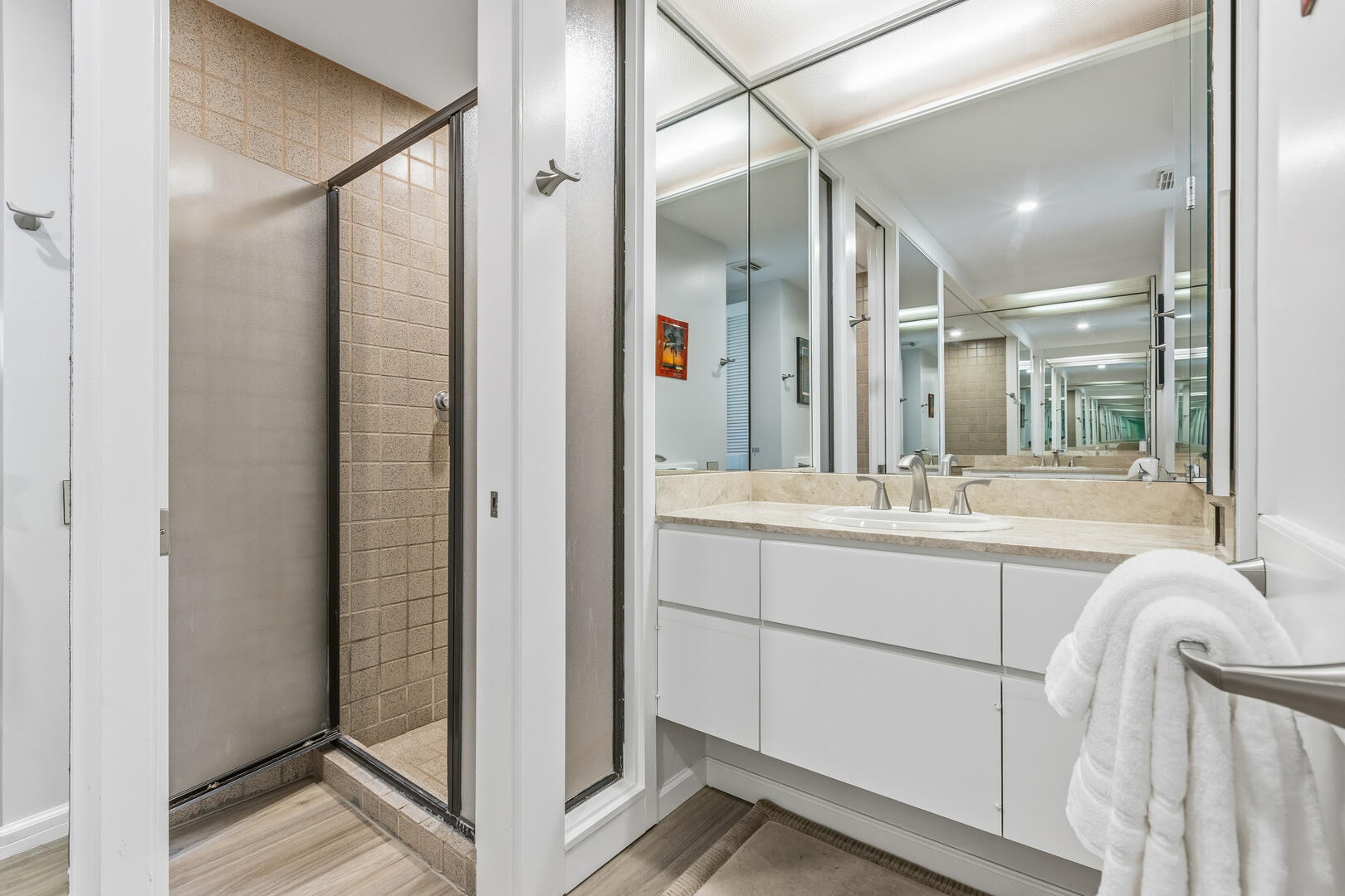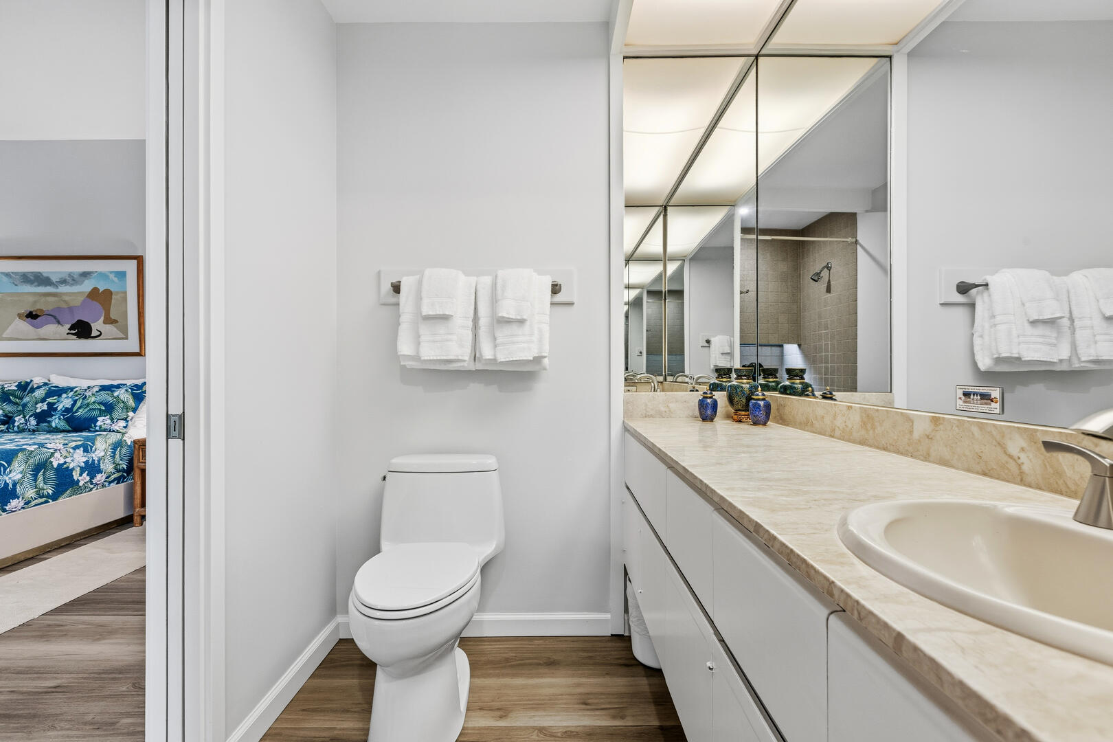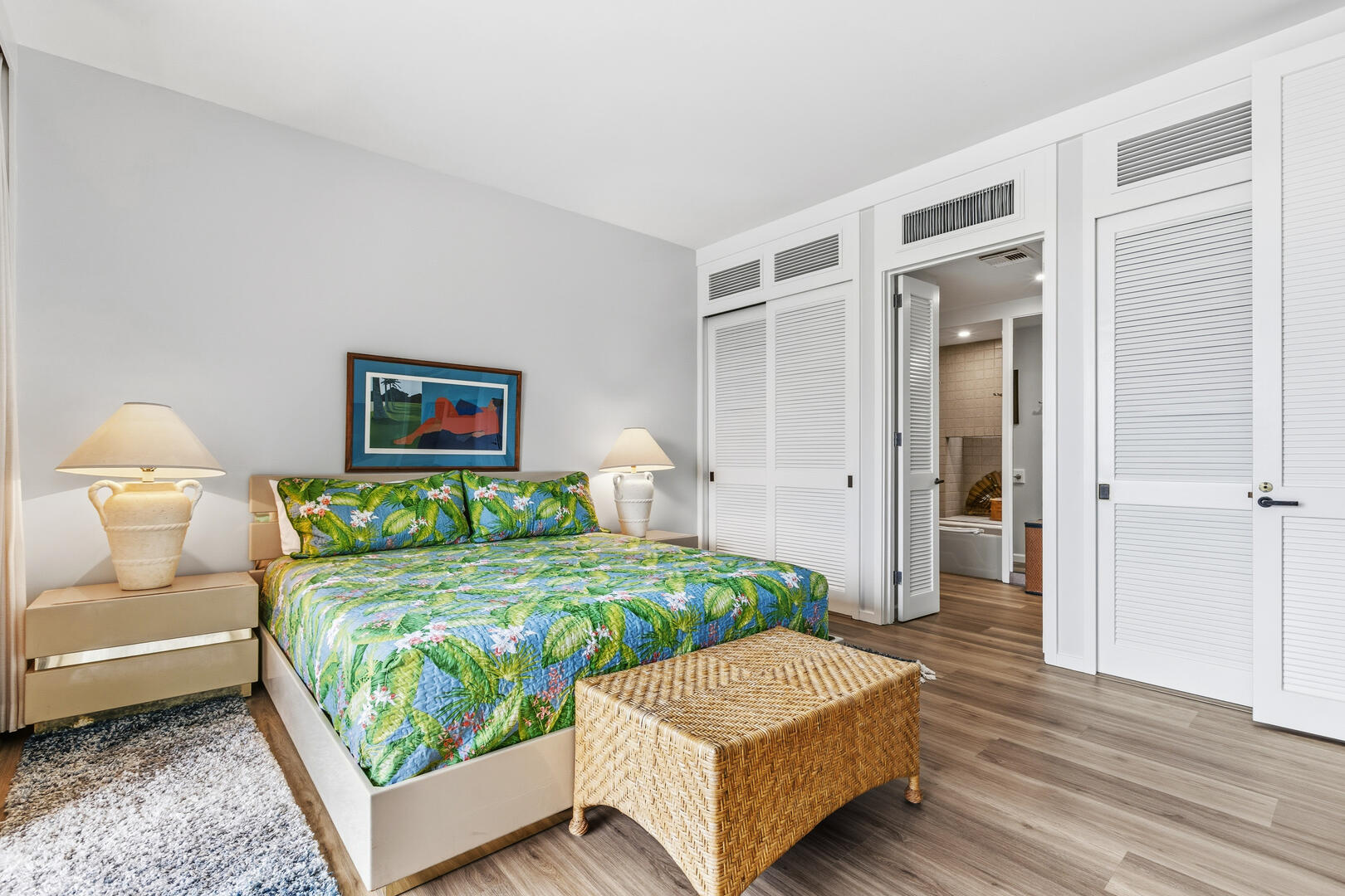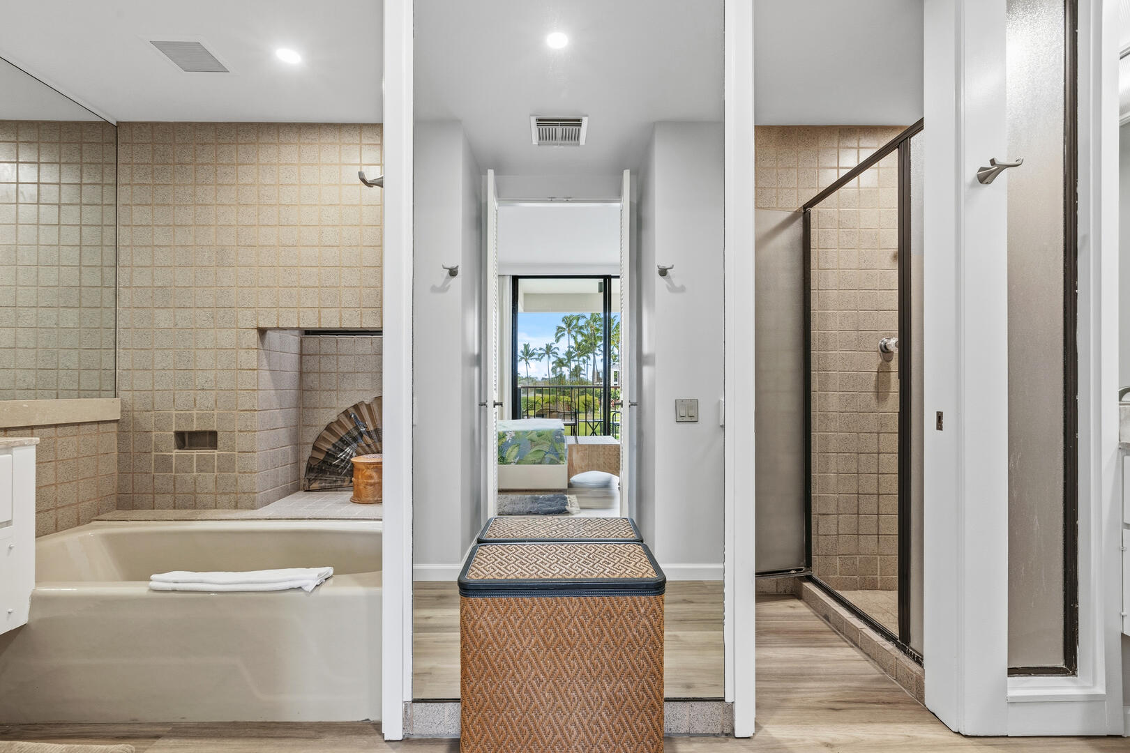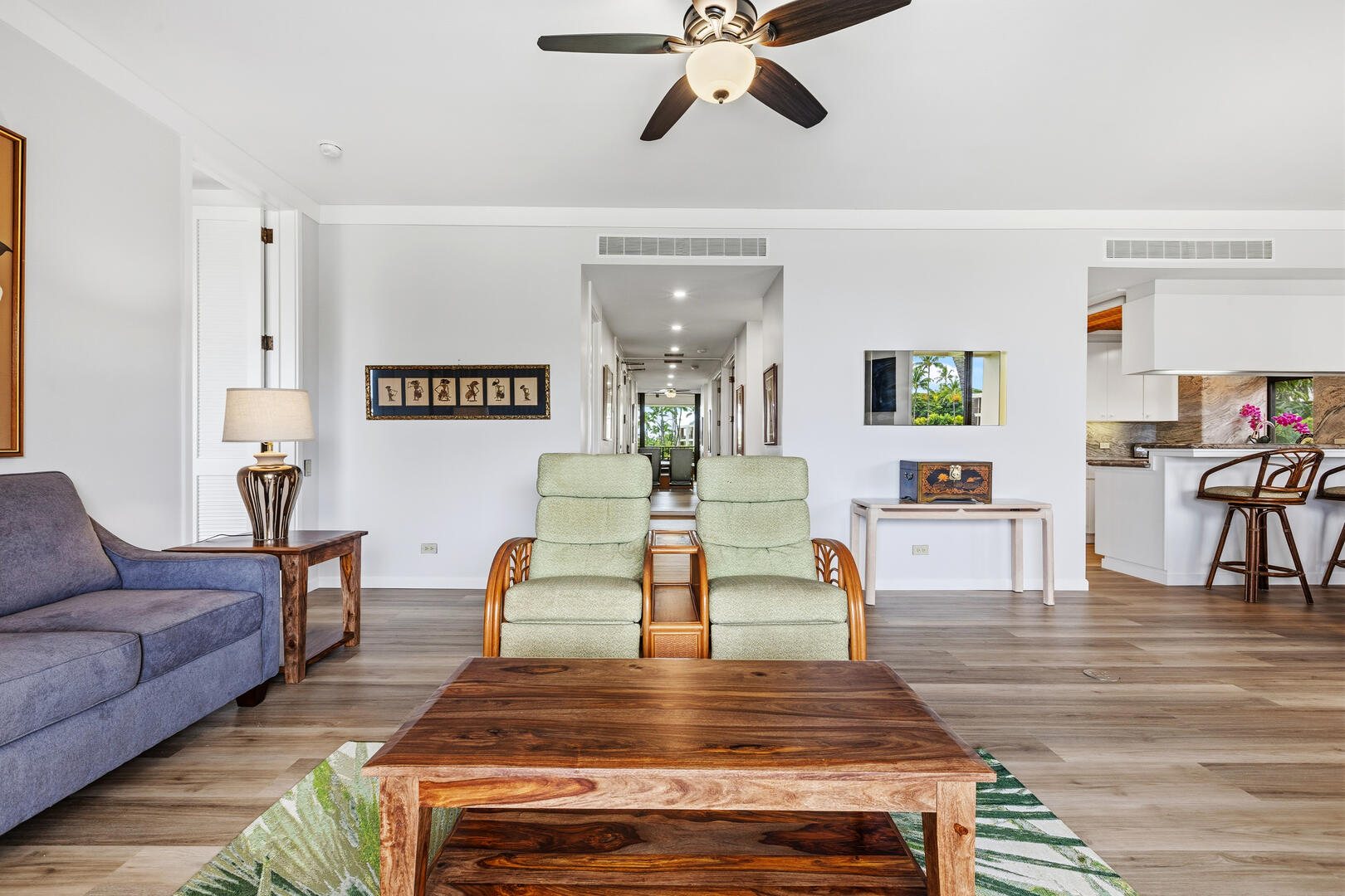 C202 is a Newly Upgraded 2-bedroom, 2.5 bath oceanfront condo only steps away from the beach at the renowned Mauna Lani Resort. The condo is spacious and has a large outdoor lanai - perfect for sunset dinners or relaxing to the sounds of the nearby surf. The living room features Island styled furnishings and Hawaiian decor with a flat screen TV. Out the glass sliding doors is a beautiful outdoor lanai with comfortable seating and a private wet bar. The master bedroom offers guests a king size bed, flat screen TV and a large private bathroom with his and her vanity sinks and separate tub and shower. The second bedroom, located by the entrance, also features a king size bed and a TV, as well as an attached full bathroom with a combined tub and shower. Both bedrooms have their own separate lanai for added privacy. A sofa sleeper is available in the living room to comfortably sleep six people.