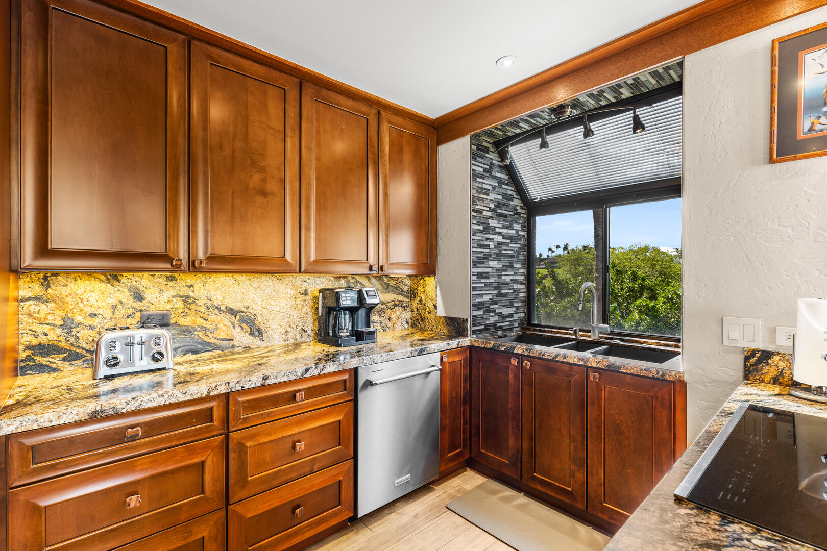 L302 is a newly renovated top-floor condo in a fantastic location only a short walk away from the beach. This 2 bedroom, 2-bath condo sits up on the third floor and features vaulted ceilings, gorgeous ocean and lagoon views with tasteful dark wicker furnishings and island decor throughout. The living room features new tile flooring, plenty of comfortable seating and television with DVD/VCR player for the family to enjoy. The kitchen has been wonderfully redone with beautiful granite counter tops and a large dining room table off to the side. The master bedroom offers guests plenty of room to relax guests with a king size bed and a television of its own while the second bedroom, perfect for the children, offers two twin beds (may be converted into a king upon request at booking) and a television as well. Both bedrooms are on different ends of the unit for maximum privacy and both feature recently redone full bathrooms as well as a private lanai with beautiful mountain and ocean views.